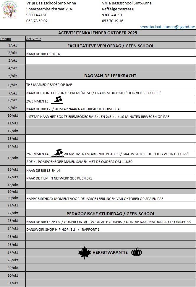 Home Schoolinfo Visie en pedagogische project Ouderbetrokkenheid Activiteitenkalender Warme maaltijden Inschrijvingen Contacteer ons Links Activiteitenkalender oktober 2025 Scholengroep Sint-Maarten Cookiebeleid Privacyverklaring VORA VZW